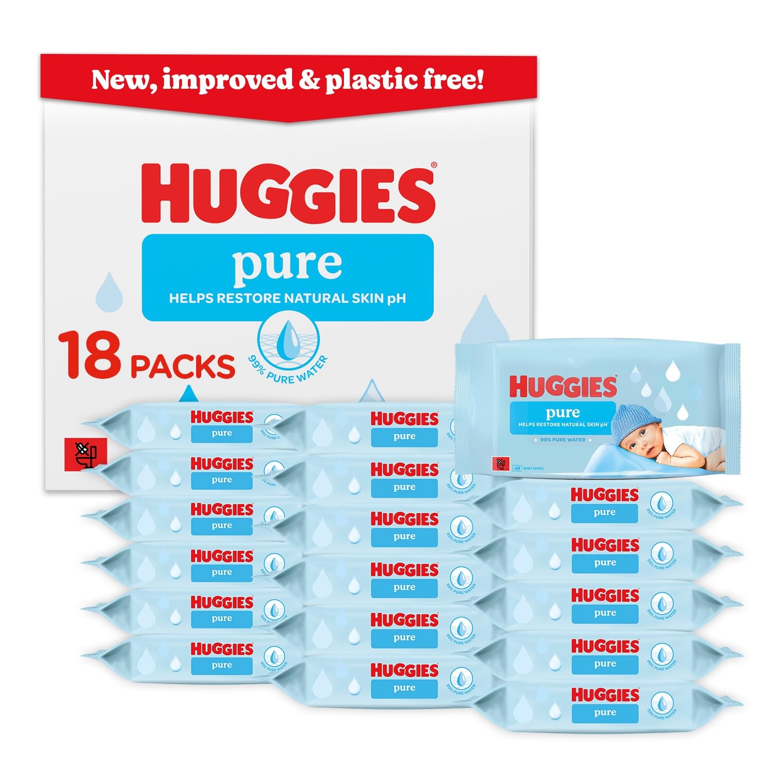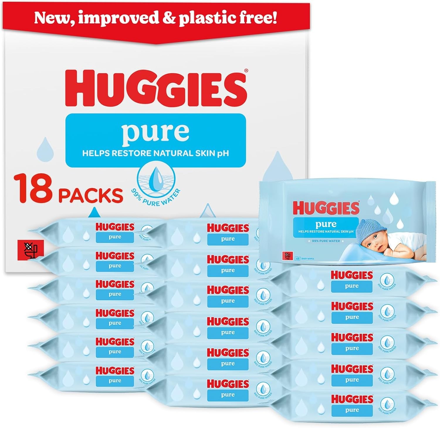 Huggies Pure Plastic Free Baby Wipes, 18 Packs of 48 (864 Wipes Total) for Sensi