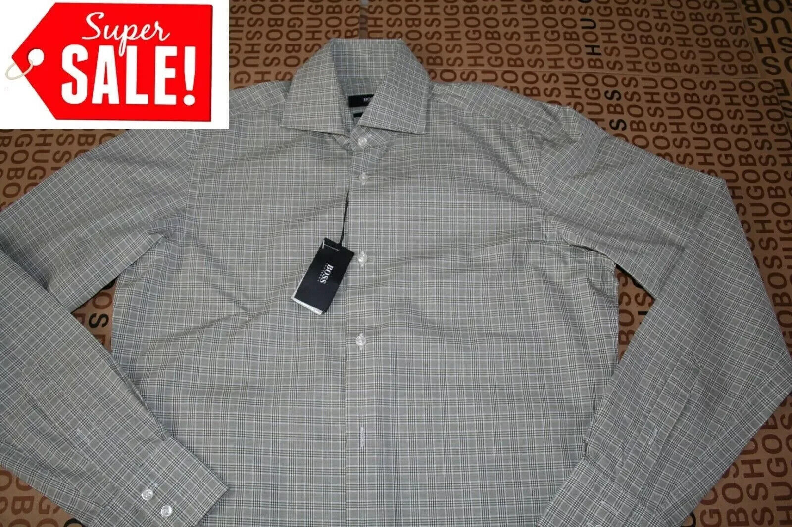 New Hugo BOSS men green check slim fit long sleeve smart casual suit shirt SMALL