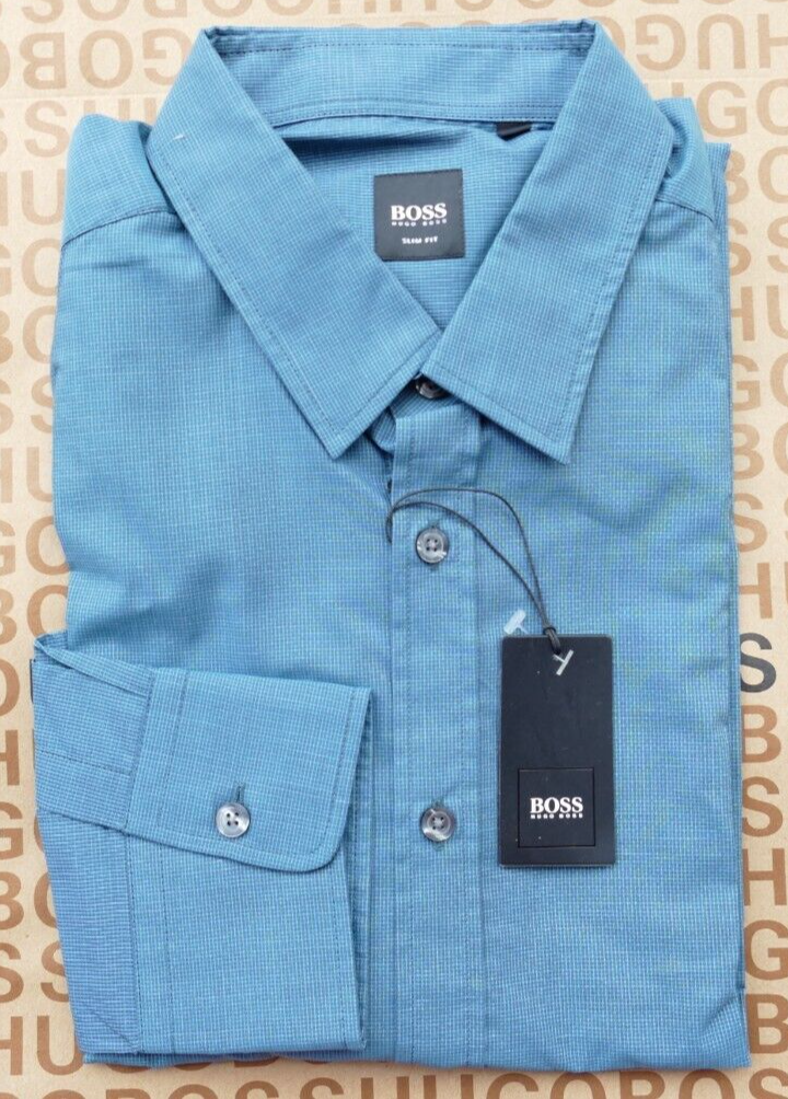 New Hugo BOSS blue green checked slim long sleeve casual smart suit shirt MEDIUM