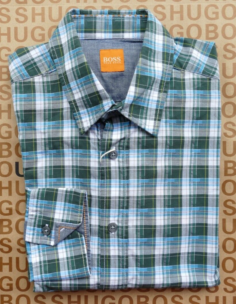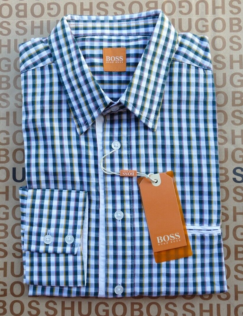 New Hugo BOSS mens green slim long sleeve casual checked suit jean shirt LARGE