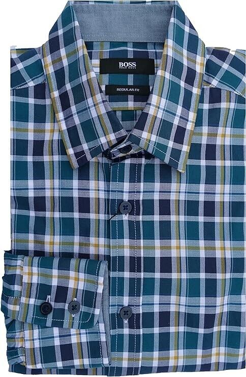New Hugo BOSS men green check regular long sleeve casual smart suit shirt MEDIUM