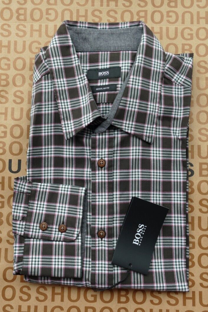 New Hugo BOSS grey brown check long sleeve regular smart casual suit shirt LARGE