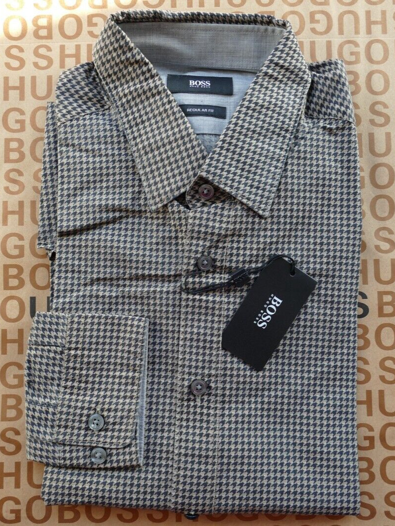 New Hugo BOSS mens grey long sleeve casual smart houndstooth suit shirt MEDIUM