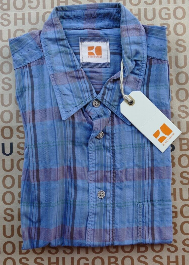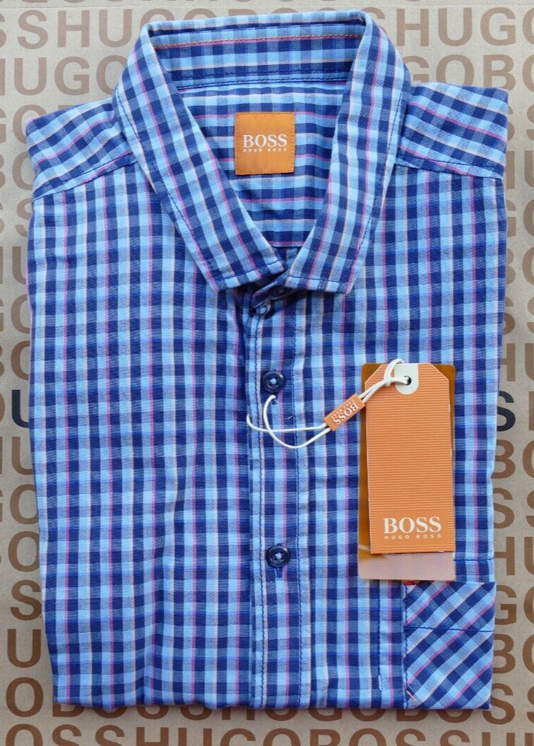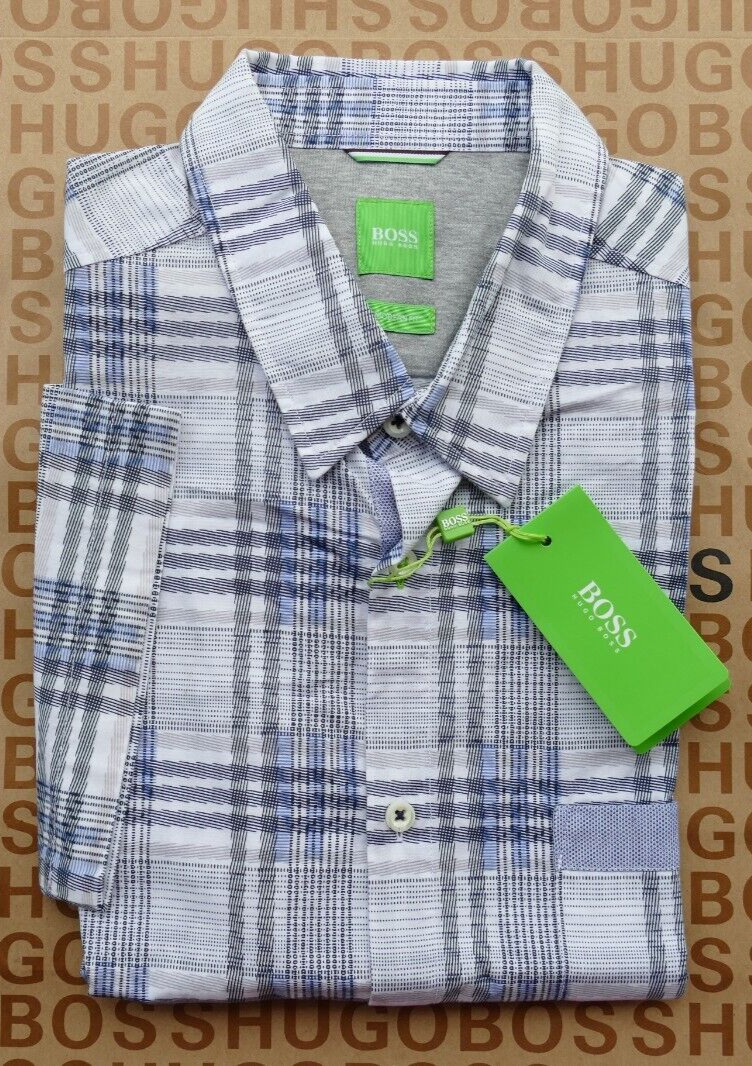 New Hugo BOSS men blue regular fit casual checked distressed fashion shirt LARGE
