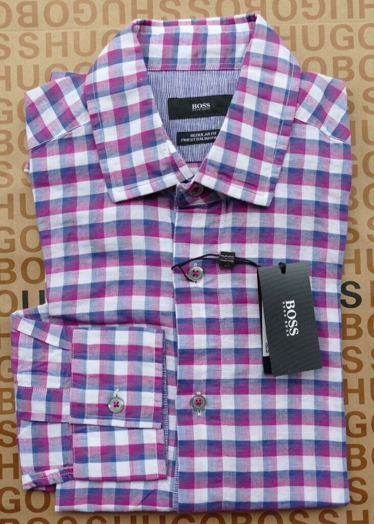 Hugo Boss Men's "Relegant" Linen Regular Fit Long Sleeve Plaid Shirt US XL IT 54