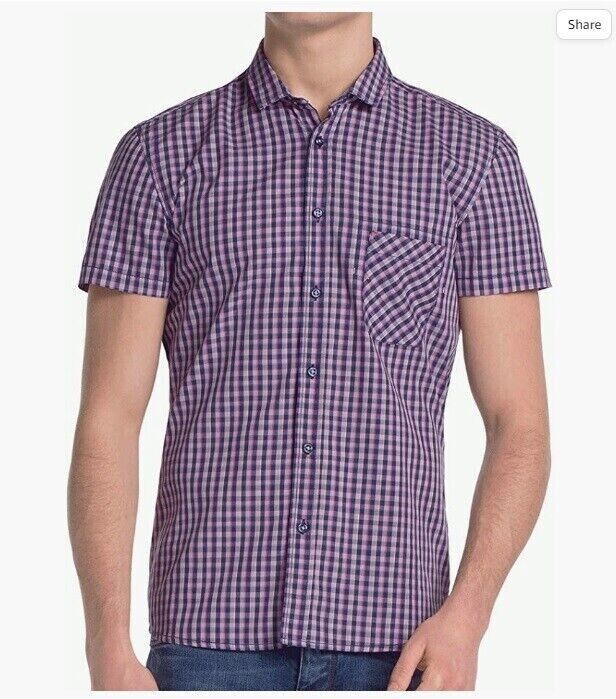 New Hugo BOSS mens purple pink checked regular fit casual smart suit shirt SMALL