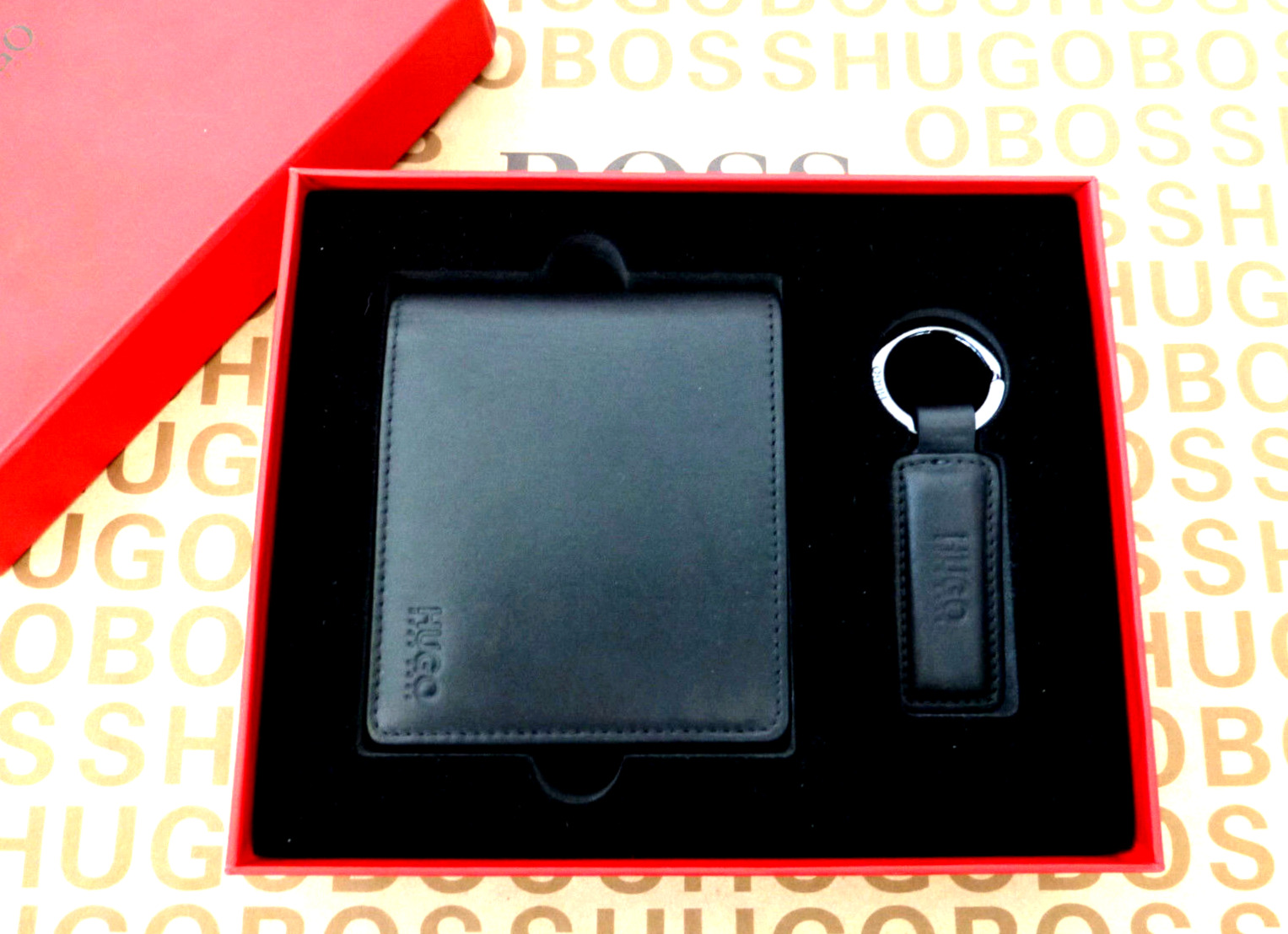 HUGO BOSS Genuine Bifold Wallet & Key Ring Set Mens Black Leather Wallets Boxed