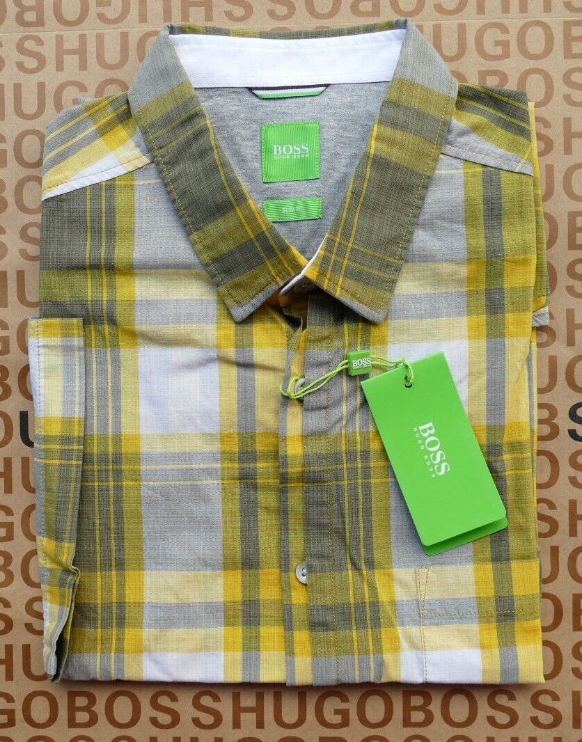 New Hugo BOSS mens green slim fit long sleeve casual check suit jean shirt LARGE