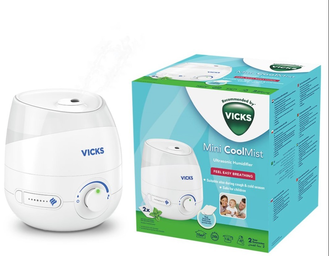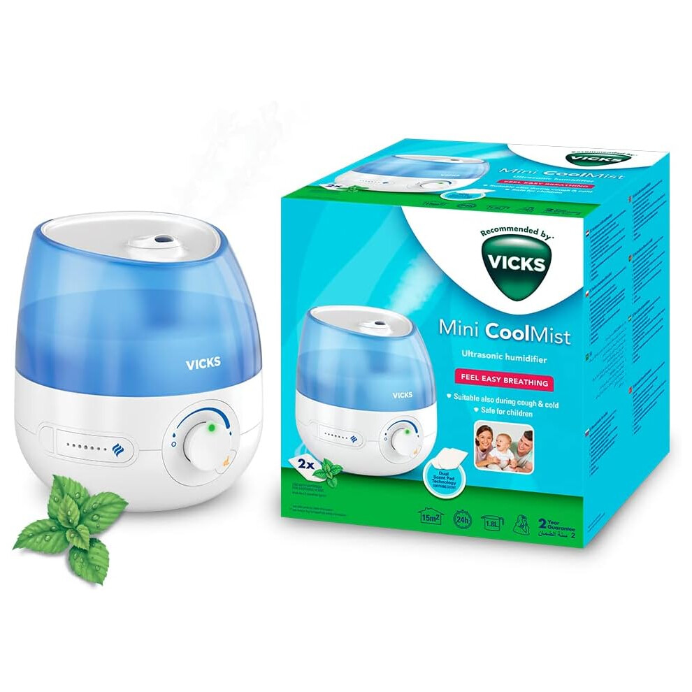 Vicks Mini Cool Mist Ultrasonic Humidifier (compact, quiet, for better sleep, cough and cold, comfort, essential oils, humidity, rooms up to 15m2