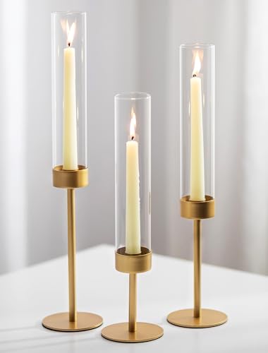Sziqiqi Gold Hurricane Candle Holders: Candlestick Holder with Glass Cylinder for Wedding Table Centerpiece - Set of 3 Metal Taper Candle Stand for Christmas Dining Mantel Fireplace Decoration