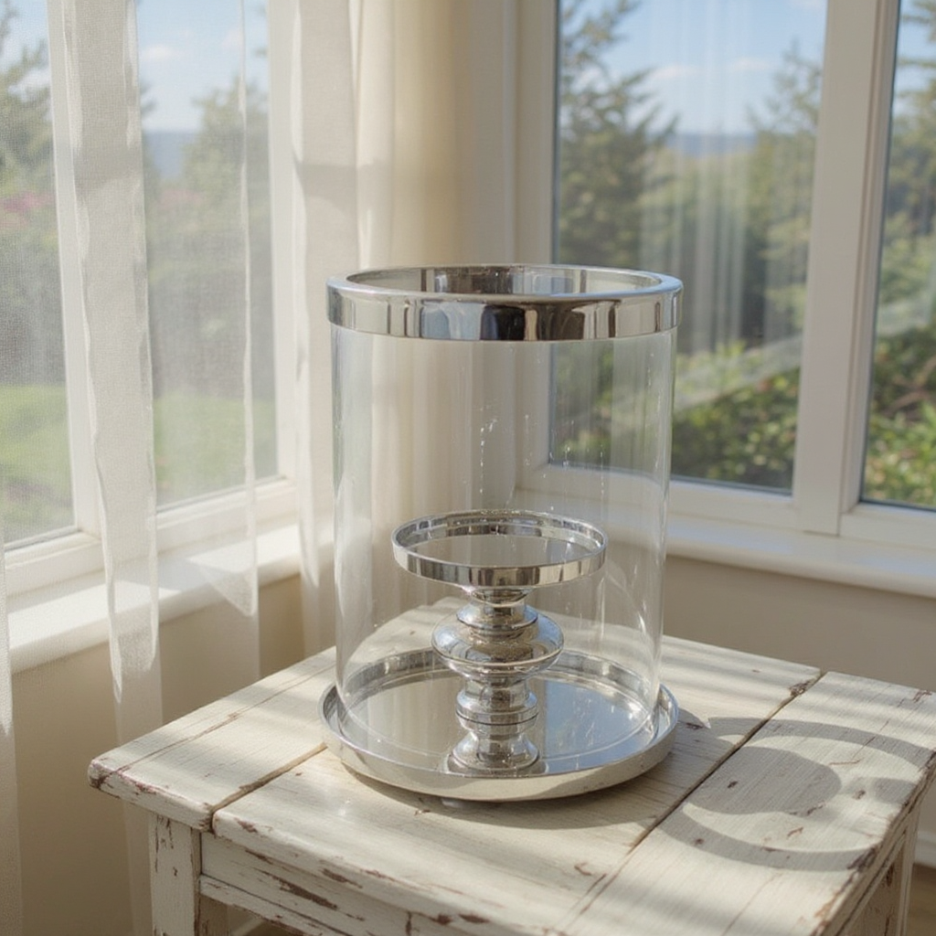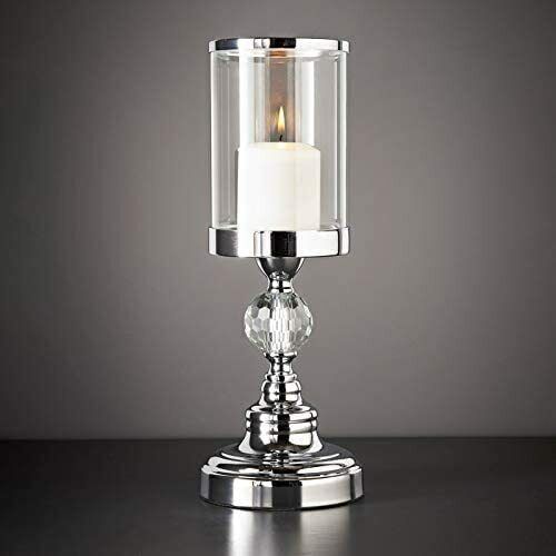 Silver Chrome Hurricane Lamp Metal & Glass Ring Candle Holder Wedding Table
