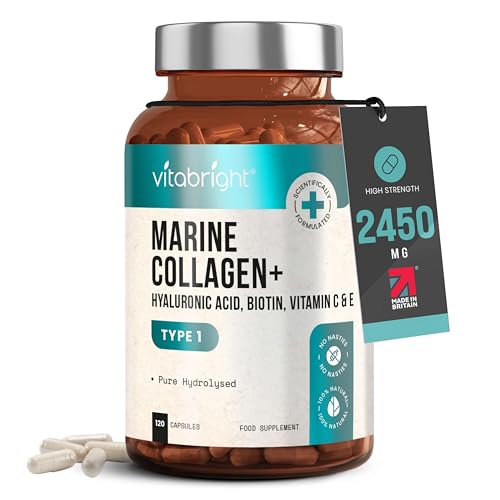 Marine Collagen Supplements for Women 2450mg Complex | 120 Hydrolyzed Marine Collagen Capsules with Hyaluronic Acid | Skin Supplements for Women | High Strength Collegen Peptides Tablets | Vitabright