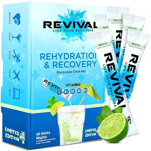 Revival Rapid Rehydration, Electrolytes Powder - High Strength Vitamin C, B1, B3, B5, B12 Supplement Sachet Drink, Effervescent Electrolyte Hydration Tablets - 30 Pack Mojito