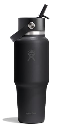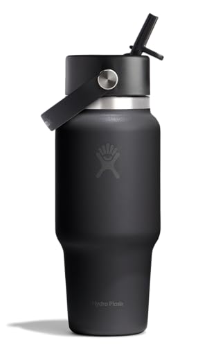 Hydro Flask – Wide Flex Straw Travel Bottle 946 ml (32 oz) – Stainless Steel, Leakproof, Fits Most Cupholders – Insulated Cold 24 Hrs – Wide Mouth, Ice Cube Friendly – Black