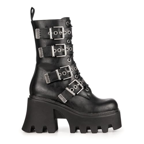 LAMODA Women's Hysteria Chunky Platform Ankle Boots in Black, Ladies Lace Up Combat Boots with Side Zipper and Functional Buckles, Vegan leather boots