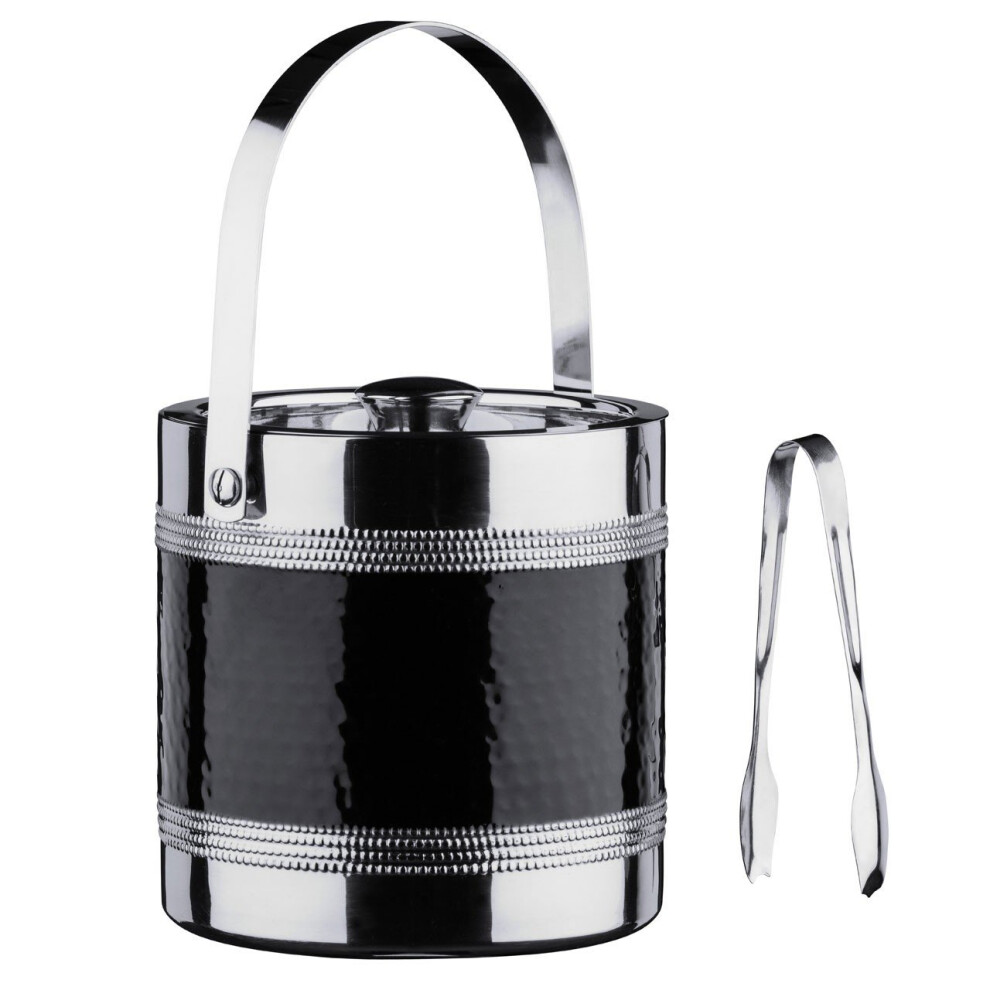 Ice Bucket and Tongs with Hammered Black Band, Stainless Steel