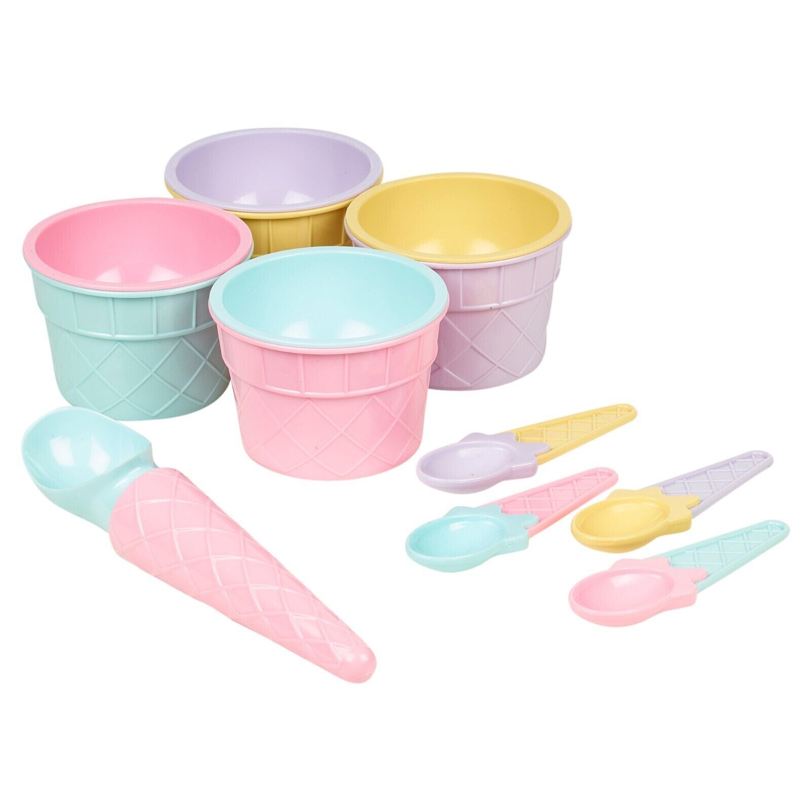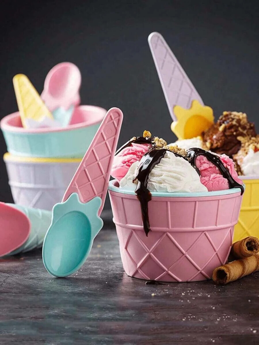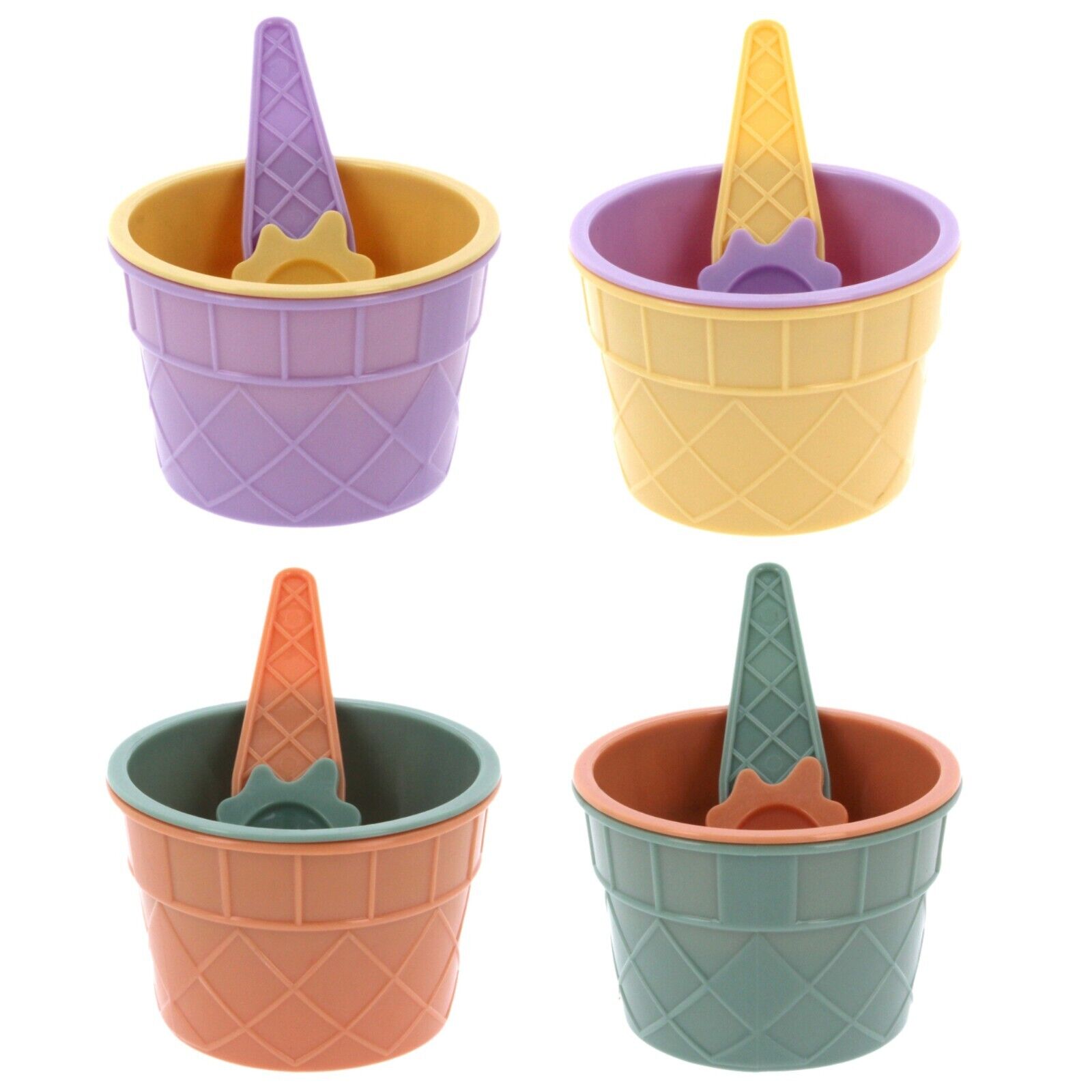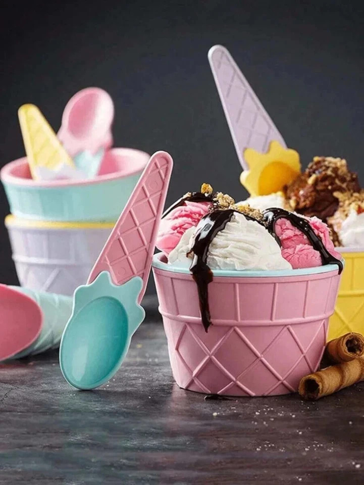 Plastic Ice Cream Bowls & Spoon Set Dessert Sundae Cone Scoop Coloured Kids 8PCS