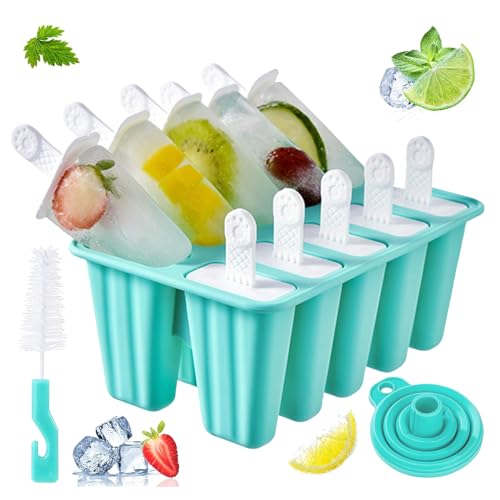 Silicone Ice Lolly Mould, 10 Pieces Popsicles Mold, Reusable Ice Pop Mold, Easy Release Ice Pop Maker, BPA Free Ice Cream Mould, Homemade Popsicle Mould with Silicone Funnel and Cleaning Brush, Green