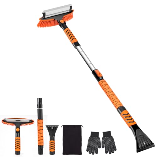 Sukudon 3 in 1 Extendable ice scraper for car windscreen non scratch,42" Removable Snow Removal Tool Brush with Squeegee,Foam Grip,270° Pivoting Brush Head snow scraper for Cars,Trucks and SUV(Orange)