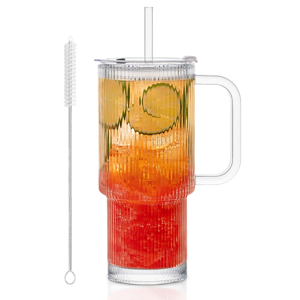 KEMORELA 768ml Ribbed Glass Tumbler with Handle, Leakproof Lid & Straw, 26oz Large Iced Coffee Glass Cup with Straw Brush, Reusable Glass for