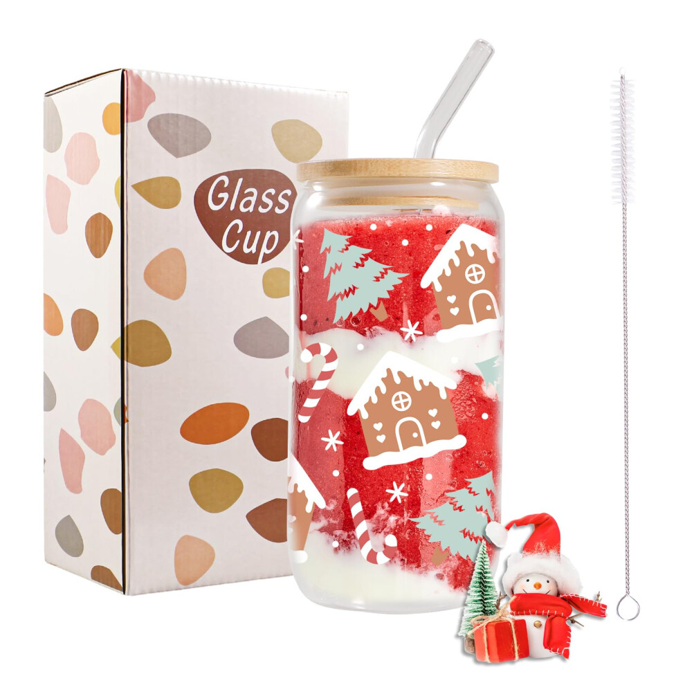 Bliceon Christmas Cups, 16oz Christmas Iced Coffee Mugs, Glass Cups with Lids and Straws, Xmas House Crutch Glass Cup for Festival Gifts, Smoothies,