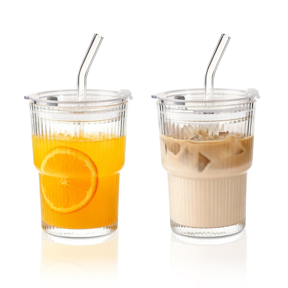 Aegistus 650ML Ribbed Glass Tumblers with Lids and Straws, Set of 2, Leakproof Cups, Coffee Glasses, Iced Coffee Cup, Glass Tumbler with Straw and Lid