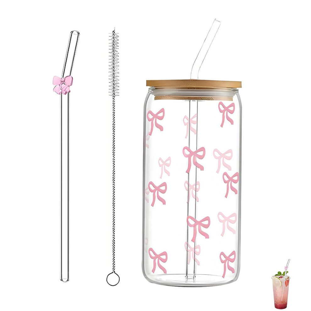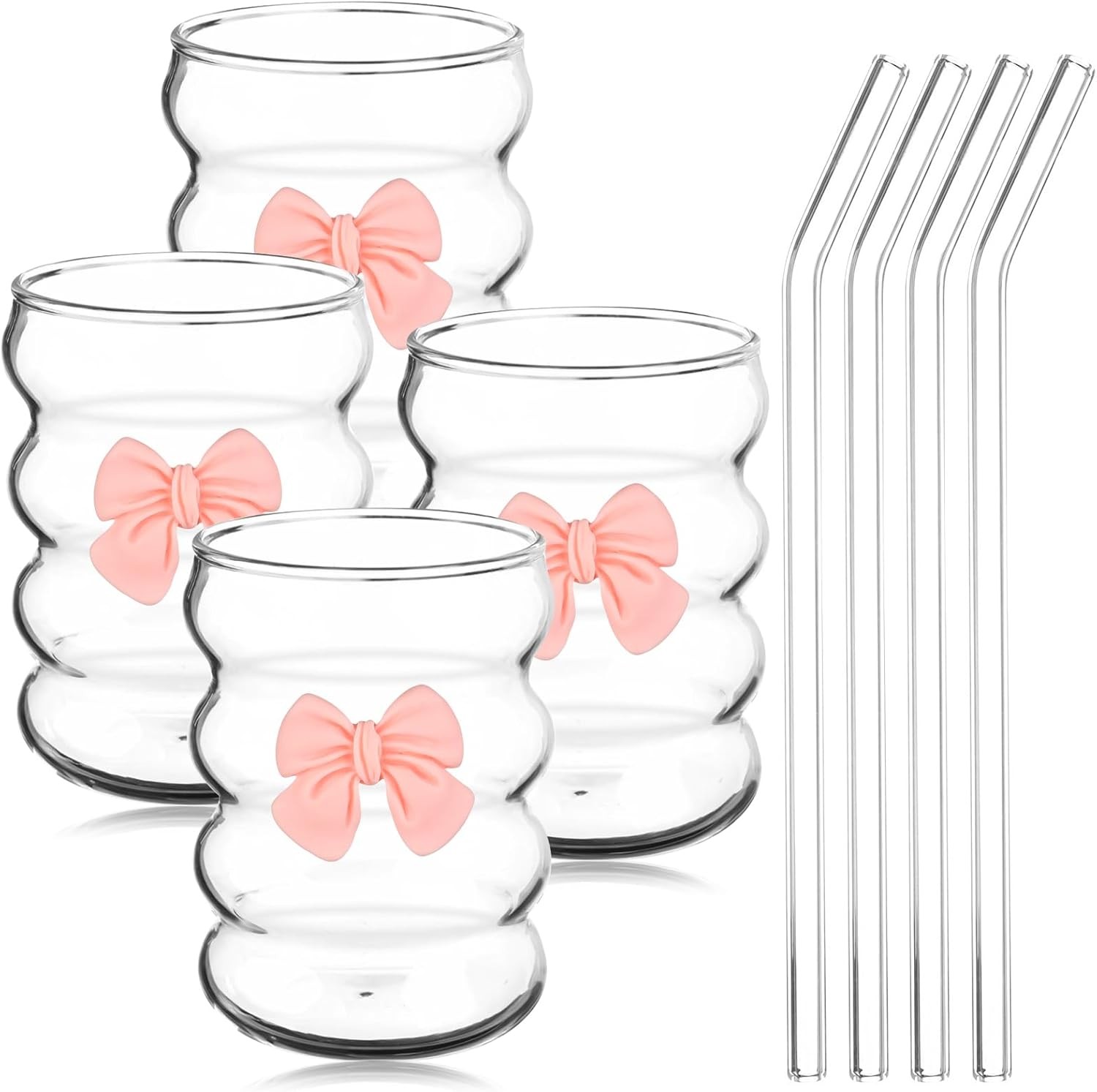 4 Pack 12 OZ Pink Bow Glass Cup with Straws Iced Coffee Cups Ripple Glass Drink
