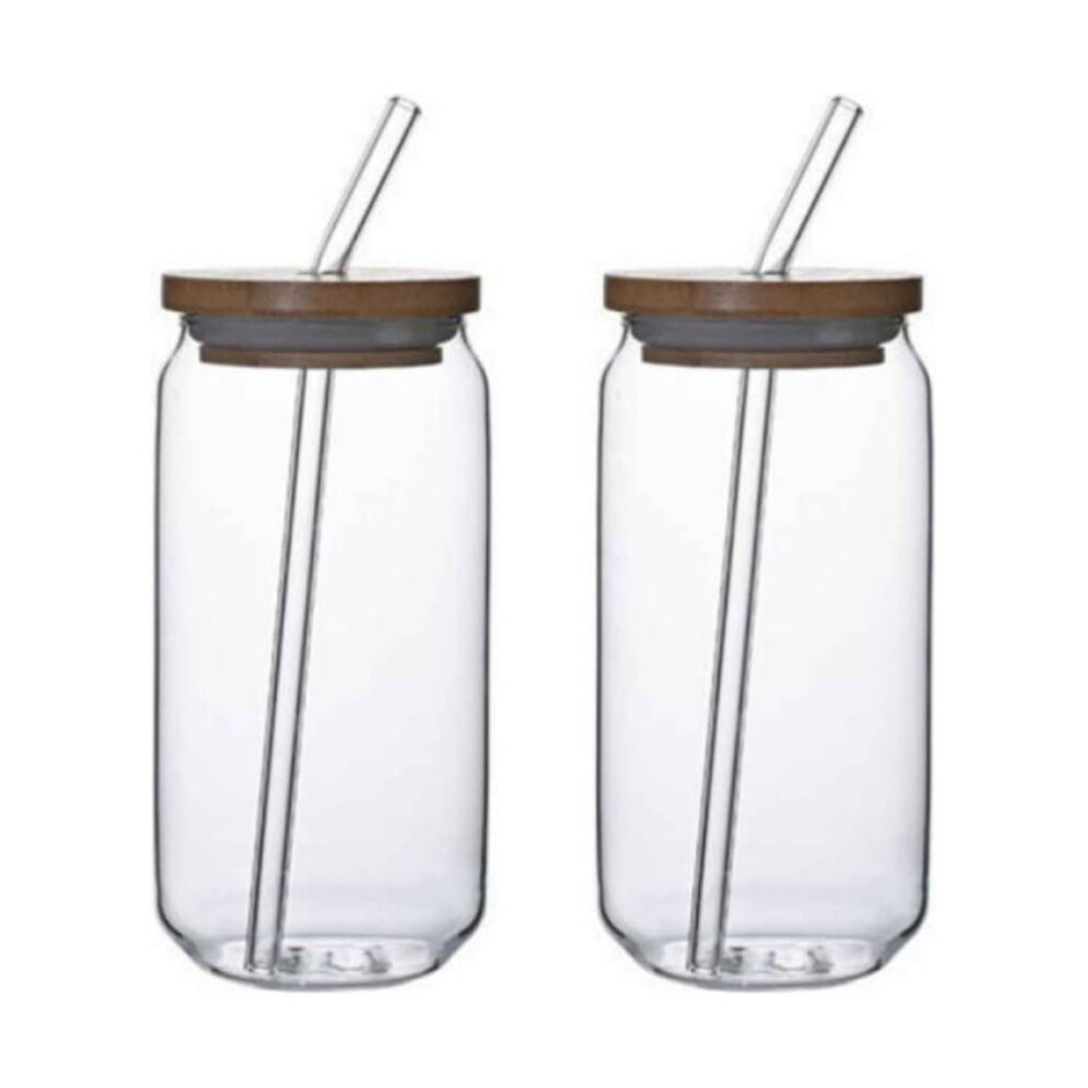 HEFTMAN Glass Cups with Lids and Straws - 2 Pack Empty 480ml Can Shaped Glasses with Airtight Bamboo Lids, Glass Straws & Straw Cleaning Brush - Iced Coffee Glass for Smoothies, Beer, Parties, BBQ