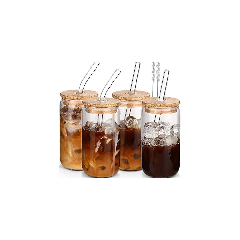 MHDCLY Iced Coffee Cup,Glass Cups with Lids and Straws,Drinking Glasses with Bamboo Lids and Glass Straw 4Pcs Set - 16Oz,Smoothie Cup,Beer