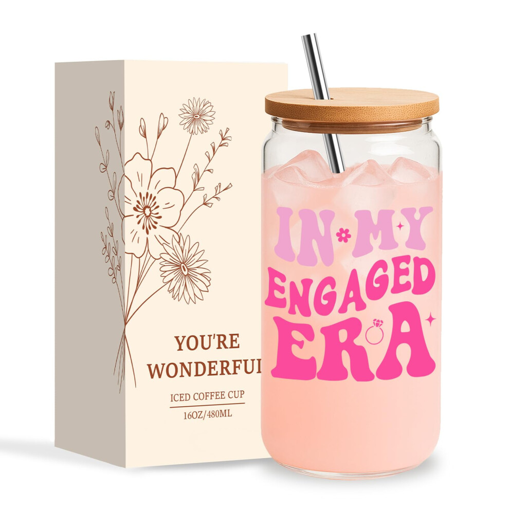 Jars Nova Engagement Gifts- Engage Gift for Couples 16oz Iced Coffee Glass Cups with Lids and Straws - Iced Coffee Gift Set for Wife (Engaged)