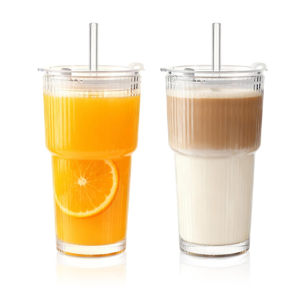 INSETLAN 2PCS 600ML Ribbed Glass Tumblers with Lids and Glass Straws, Leakproof Glass Cups, Coffee Glasses, Iced Coffee Cup, Glass Tumbler with Straw