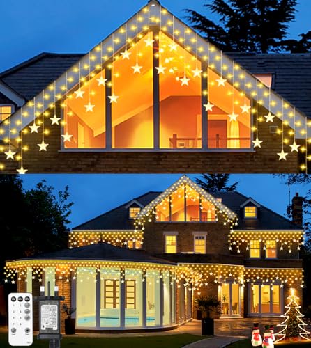 ULIGHTOWN Icicle Lights Outdoor, 9M/29.5FT Star Icicle Outdoor Christmas Lights, IP44 Waterproof&8 Modes&3 Timer&4 Brightness Fairy Lights Plug in for Indoor,Eaves, Window,Festival Decor-Warm White