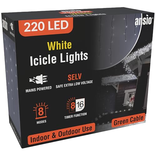 ANSIO® Christmas Lights 220 LED 7.5m/24ft Icicle Lights Outdoor & Indoor Cool White Decorations String Fairy Outside Lights with Timer for Xmas Garden Bedroom & Party|Mains Powered Green Cable
