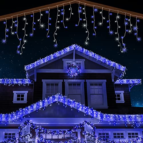 Christmas Connectable Icicle string Lights Outdoor Waterproof with 8 Multi-Function, Timer & Memory (Blue & Bright White, 5m)