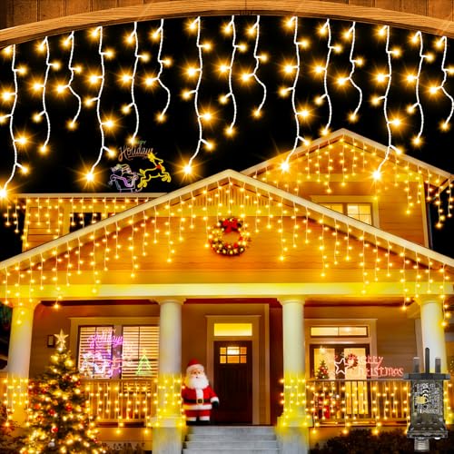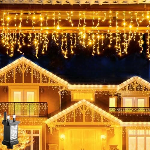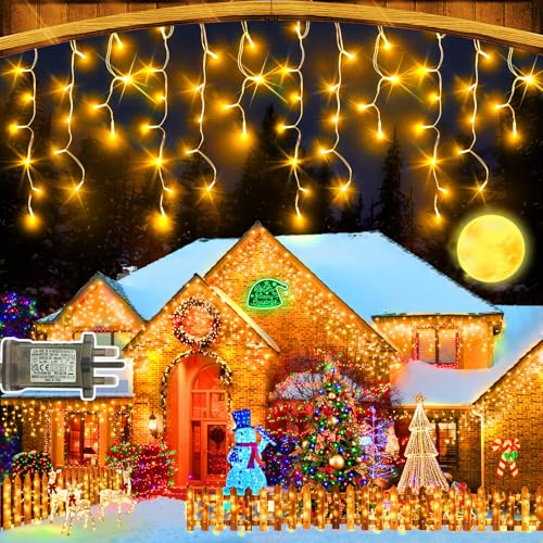 Buudala Icicle Lights Outdoor Xmas, Icicle Christmas Light 8 Modes Plug-in IP65 Waterproof Light Up Decoration Fairy Lights for Roof Window Decor (Golden-Warm, 640LED 20.5+5m)