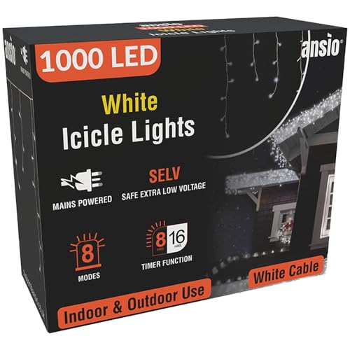 ANSIO® Outdoor Christmas Lights 1000 LED 35m/112ft Icicle Lights Outdoor & Indoor Cool White Decorations String Fairy Outside Lights with Timer for Xmas Garden & Party | Mains Powered White Cable