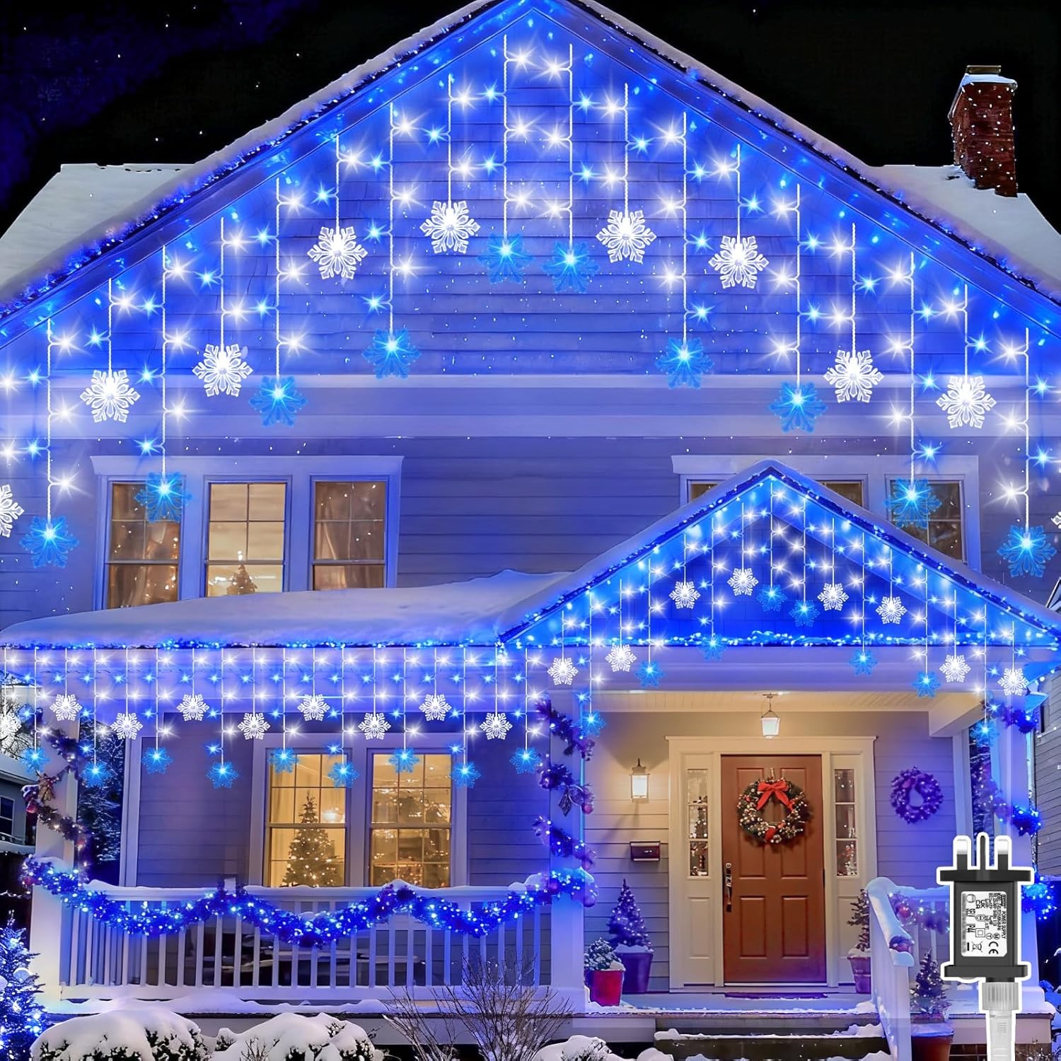 Dalugo Christmas Icicle Lights Outdoor, 10M 240 LED Snowflake Lights Blue and White Mains Powered with 6H Timer, Memory Function, 8 Modes Waterproof for Porch, Railing, Eave, Christmas Decor