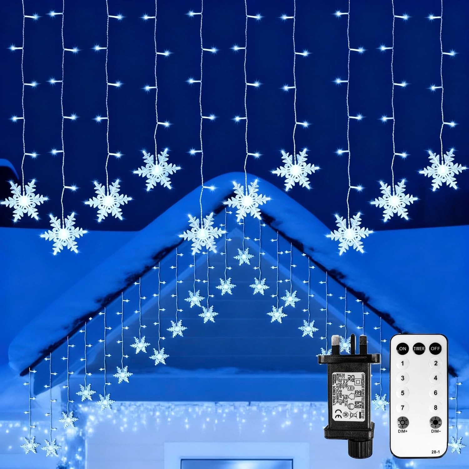 Dalugo Icicle Christmas Lights, 240 LED 10M Warm White Snowflake Icicle Lights Outdoor with Memory Function, 6H Timer, 8 Modes Waterproof Mains Powered for Christmas Decor, Balcony, Porch, Eave
