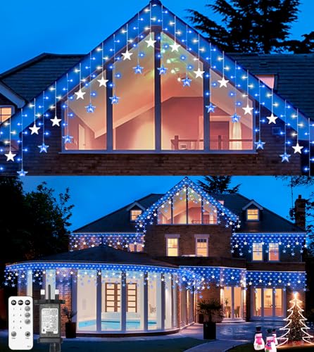 ULIGHTOWN Icicle Lights Outdoor, 9M/29.5FT Star Icicle Outdoor Christmas Lights, IP44 Waterproof&8 Modes&3 Timer&4 Brightness Fairy Lights Plug in for Indoor,Eaves,Window,Festival Decor-Blue White
