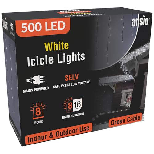 ANSIO® Outdoor Christmas Lights 500 LED 17.4m/56ft Icicle Lights Outdoor & Indoor Cool White Decorations String Fairy Outside Lights with Timer for Xmas Garden Bedroom Party|Mains Powered Green Cable