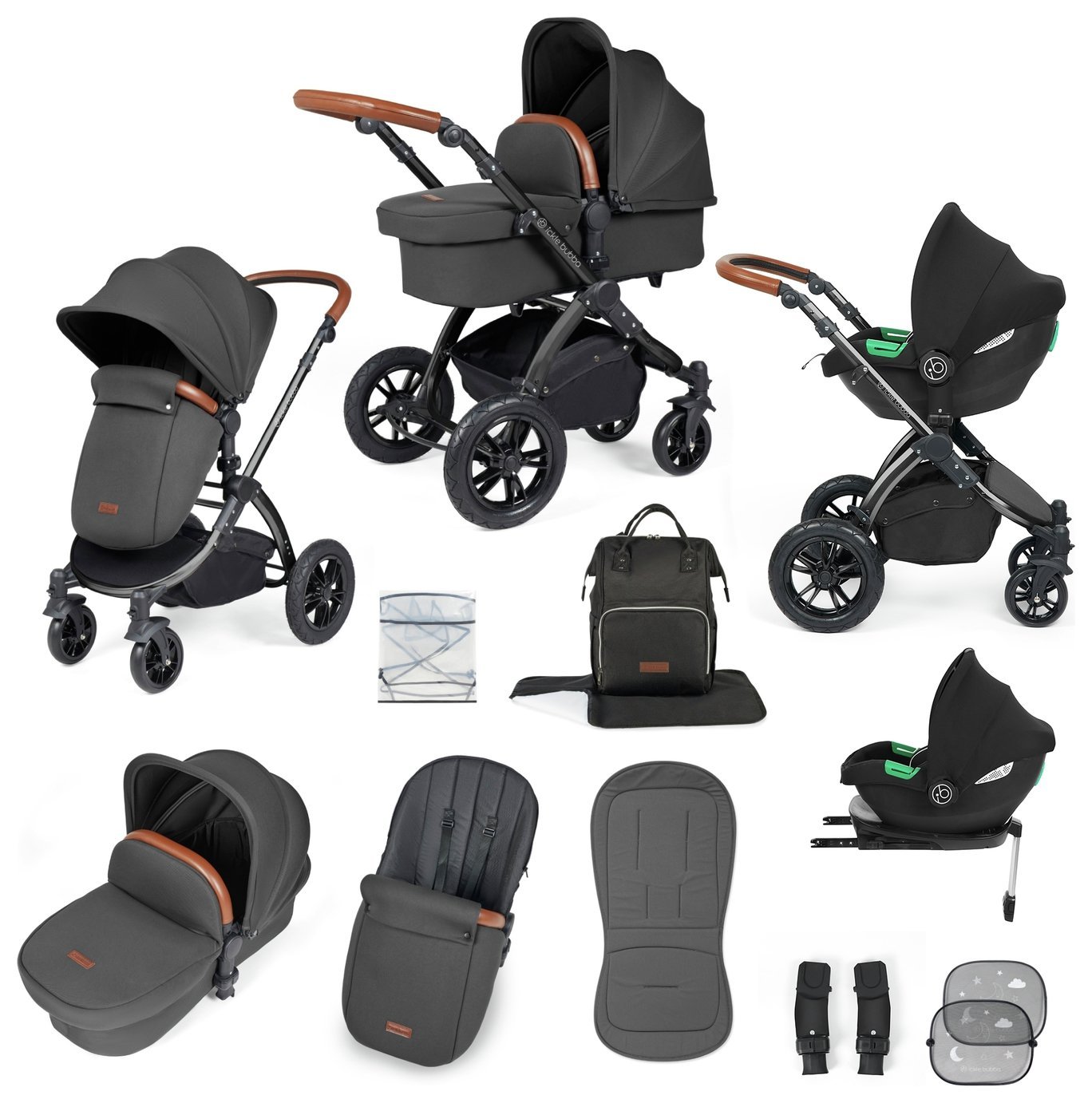Ickle Bubba Stomp Luxe 12-Piece Travel System with i-Size Stratus Car Seat & ISOFIX Base – All-Terrain Pram, Pushchair, Carrycot, Footwarmer & Rain Cover, Birth to 4 Years* (Black/Charcoal Grey/Tan)