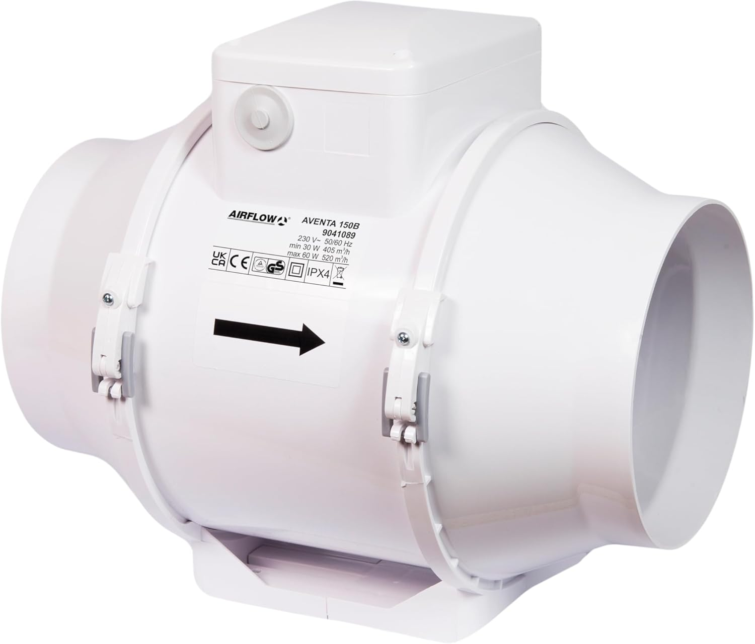 Airflow Aventa 150T In-Line Extractor Fan with Timer – 30W Energy-Saving, 112-144 l/s Flow Rate, 2-Speed, Adjustable Timer (2-30 Minutes), Compact (250x295x185 mm), Fits 150mm Duct, 3-Year Warranty