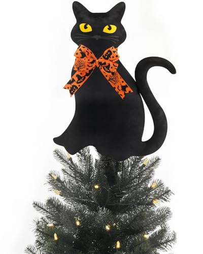Black Cats Christmas Tree Topper with Stand and Changeable Bows Halloween Xmas Tree Ornament Winter Holidays Home Decorations Cat Lovers Gift Ideas