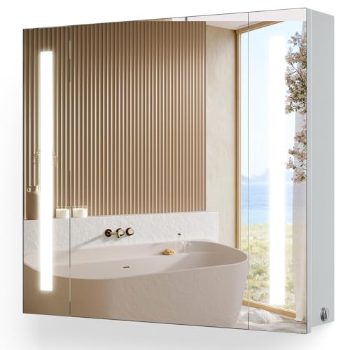 YOLEO Illuminated Bathroom Mirror Cabinet, Wall-Mounted Bathroom Cupboard with Shaver Socket, Demister Pad & Button Switch Control, LED Mirror Cabinet For Makeup Shaver Charging, IP44 650×600 MM