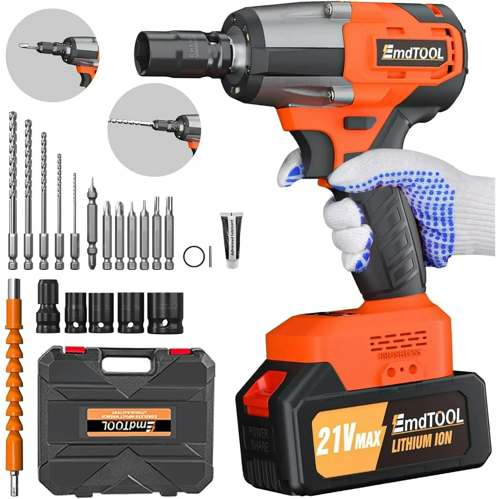 Impact Wrench with Battery and Charger, 1/2 Inch Cordless Impact Gun Brushless, 450Nm High Torque, Power Drill Driver Wrench Tool with Adaptor, 4 Sockets, 5 Drill Bits, 7 Screws - Orange