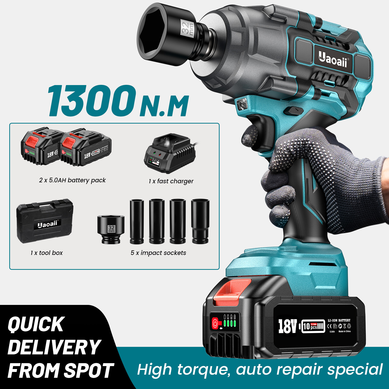 1000N.m 1/2inch High Torque Impact Wrench Gun With Battery & Charger, Socket Set
