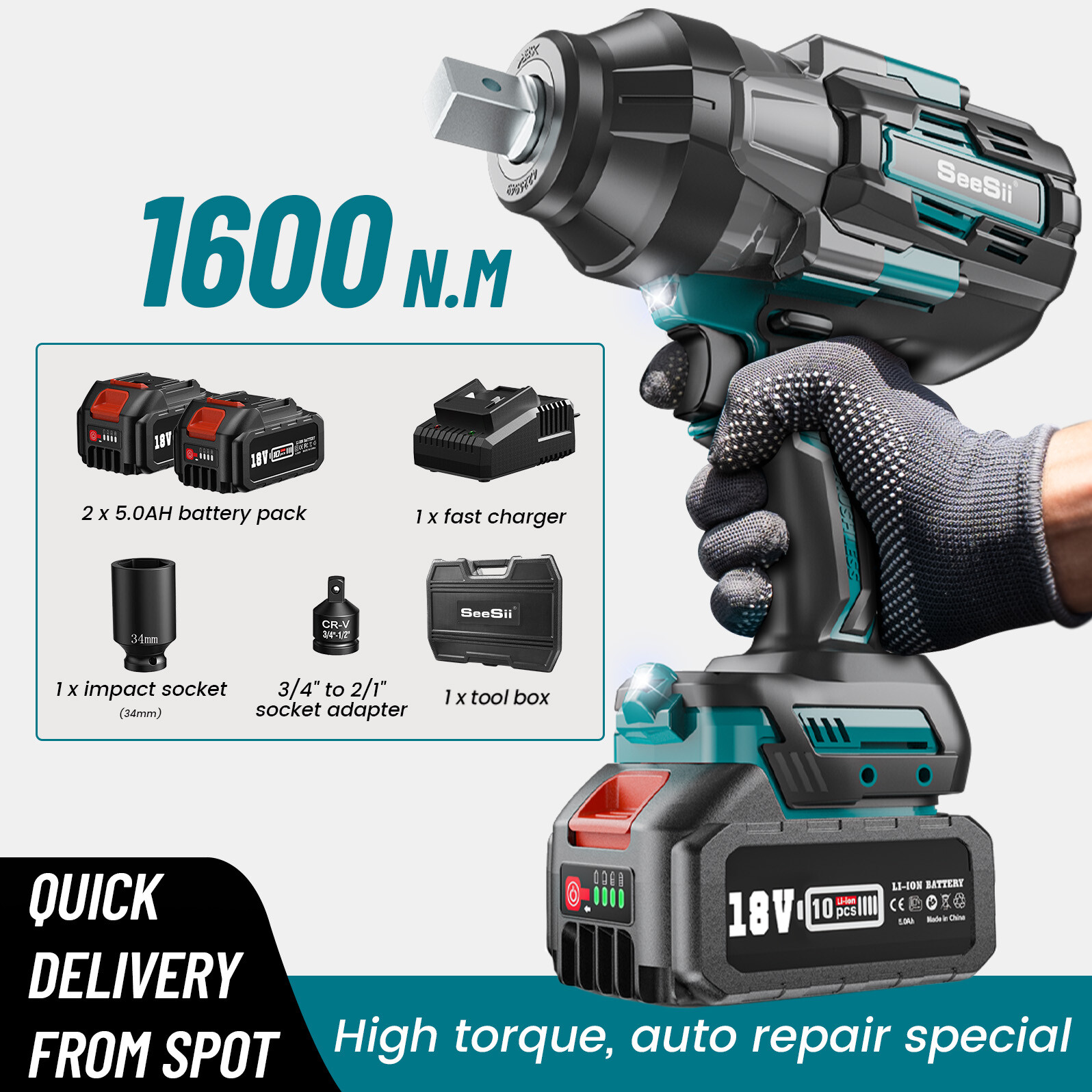 1000N.m Electric Impact Gun 1/2in Cordless Impact Wrench ,Fast Charger,4 Sockets
