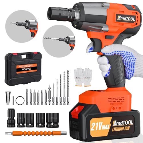 Dong Cheng 20V Cordless Impact Wrench, Max Torque 488N.m (360 ft-lbs), 1/2 inch with 3 Mode Speed, 2400 RPM Brushless Impact Gun, Includes 4.0Ah Battery, Charger, 4 Impact Sockets and Storage Box