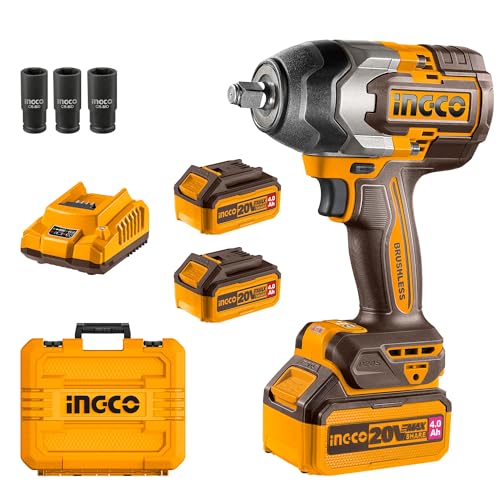 Ingco Brushless Impact Wrench 500Nm Nut-Busting Torque 650Nm, 20V Cordless 1/2Inch Battery Impact Gun, 2200RPM with 2Pcs 4.0Ah Battery and 1Pcs Fast Charger CIWLI2050