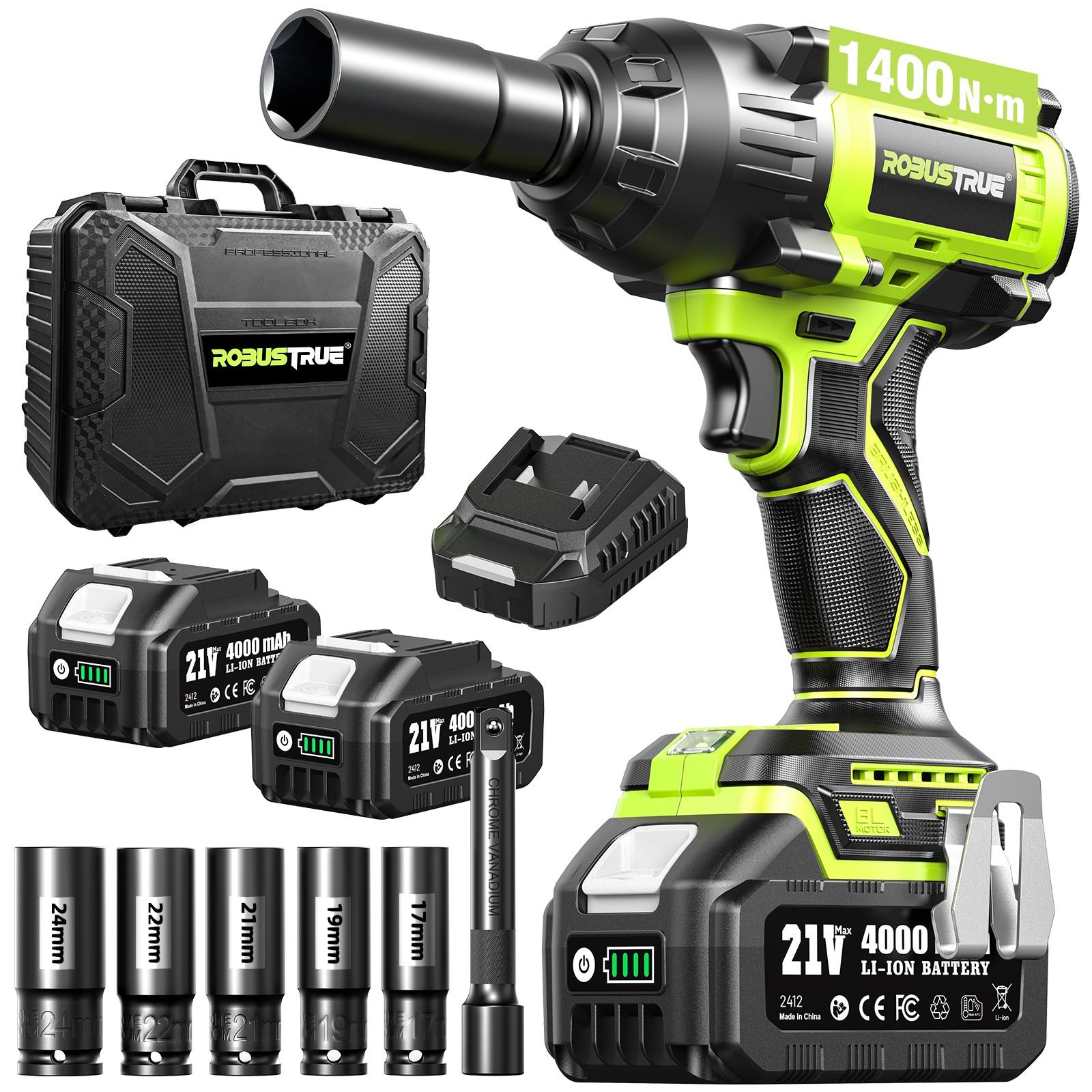 1400N.m 1/2in High Torque Brushless Impact Gun,2*5000mAh Battery Impact Wrench